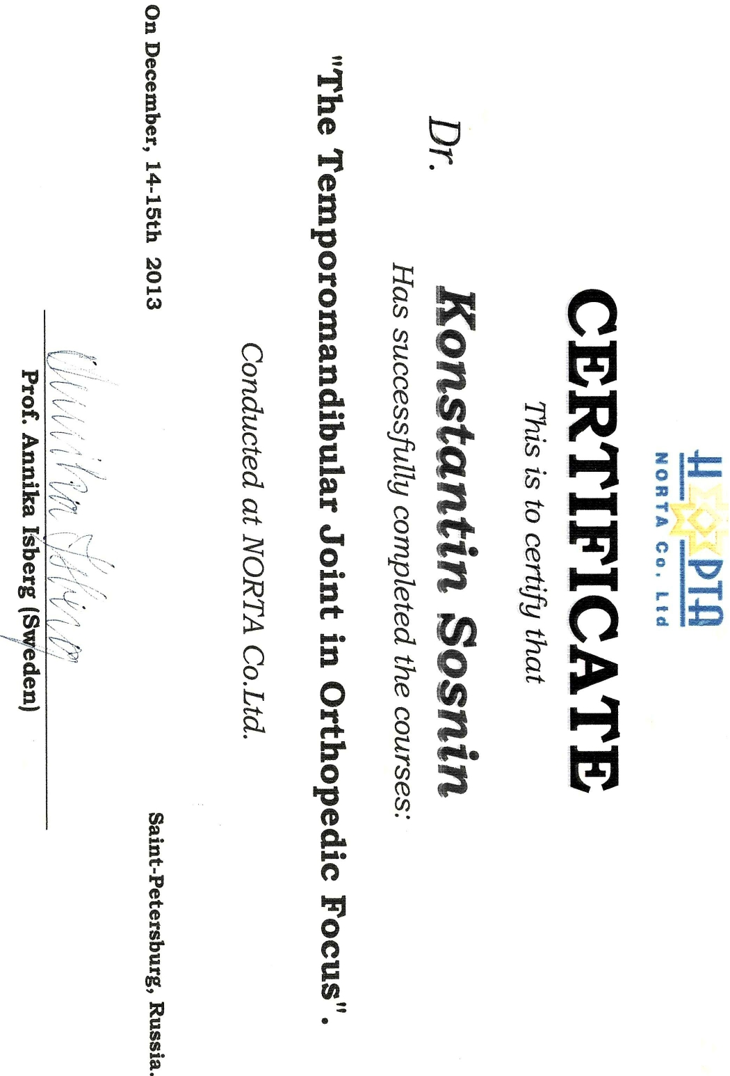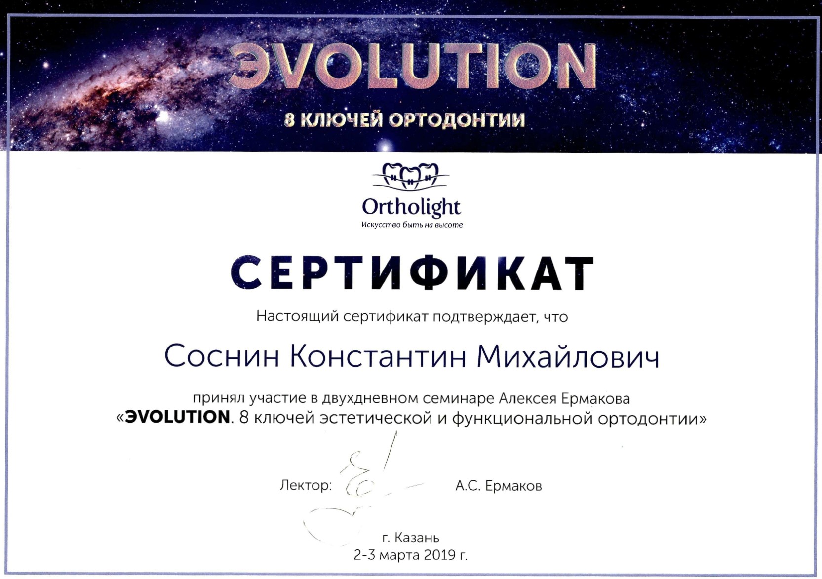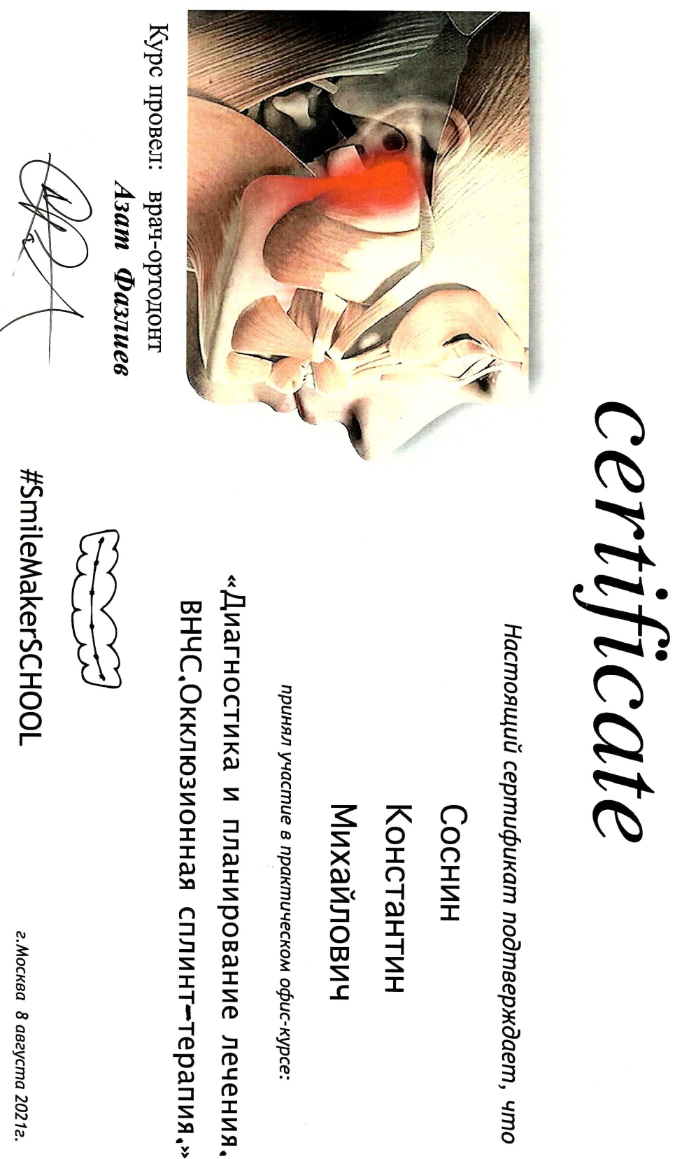 Послевузовское образование (ординатура). Сертификат "Ортодонтия" - 2015г.